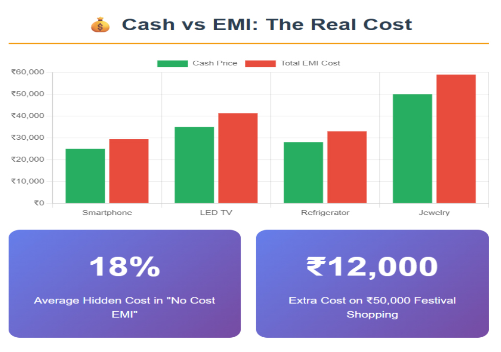 The “No Cost EMI” and “Zero Down Payment” offers that flood the market during festivals are not as beneficial as they appear. These schemes often include hidden charges, processing fees, and interest costs built into the product price. What seems like a Rs. 5,000 purchase can easily become Rs. 6,000 or more when all costs are calculated.