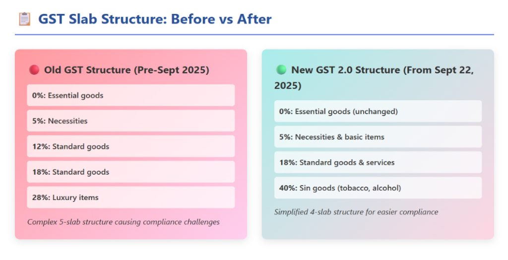India’s tax landscape is undergoing a historic transformation with the implementation of GST 2.0 from September 22, 2025. This landmark reform simplifies the complex tax structure into just three main slabs (5%, 18%, and 40%), promising to boost consumption, ease compliance burdens, and fuel economic growth across sectors.