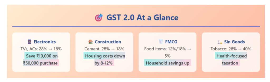 - Consumer Goods (FMCG): Lowering GST could directly make daily-use items cheaper.